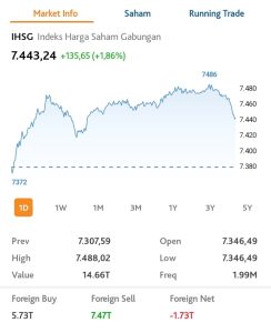 minahasaraya.com – Jelang penutupan perdagangan Bursa Efek Indonesia (BEI), Jumat, 10 April 2026, pukul 15.30 WIB, Indeks Harga Saham Gabungan (IHSG) beranjak naik ke level 7.443,24 naik 135,65 poin atau 1,86 persen. Posisi IHSG ini naik dari penutupan perdagangan Kamis kemarin, yang berada di posisi 7.307,59.