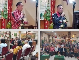 Gambar: Theo L Sambuaga (Kiri Atas) dan Dino Bravo Imbar (Kanan Atas), Saat Sambutan di Perayaan Natal Kerukunan Keluarga Mahakeret dan Sekitarnya (MASEK).