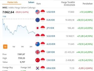 minahasaraya.com – Menjelang penutupan perdagangan Bursa Efek Indonesia, Selasa 31 Maret 2026, pukul 15.00 WIB, nilai tukar rupiah terhadap dolar kini menembus Rp17.000, atau melemah 13 poin atau 0,08 persen.