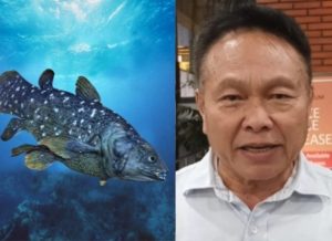 Gambar: Ikan Purba Coelacanth dan Prof Ir Kawilarang Warouw Alex Masengi, MSc, PhD (Kolase: Minahasaraya.com/hvs)